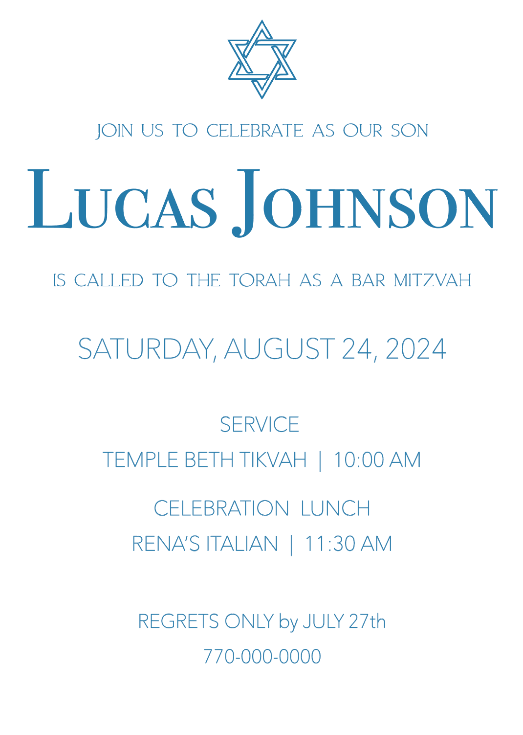 The Mitzvah Celebration Invitation is a classic invitation to celebrate in simple style for such a big accomplishment.