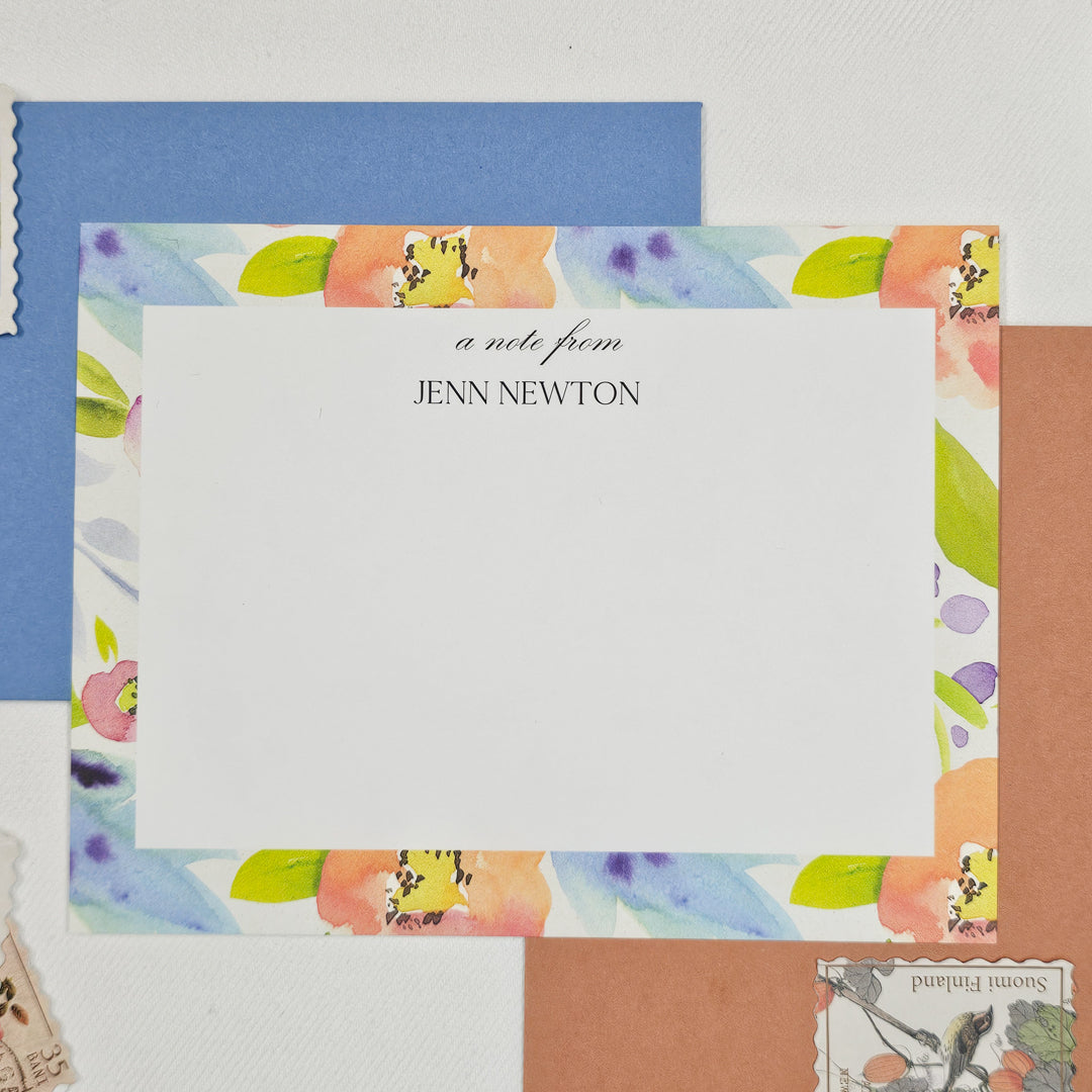 The Poppies notecard set brings a bright, painterly touch to your everyday correspondence. Its watercolor border in soft oranges, blues, and greens adds a warm, uplifting feel that makes each note a little more joyful. Printed on premium 120# cardstock, the cards offer a smooth, substantial writing surface that elevates both quick hellos and more thoughtful messages. Pair with color or classic white envelopes, and add optional return address printing for a polished finish.