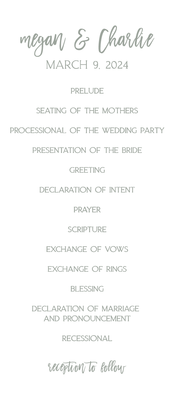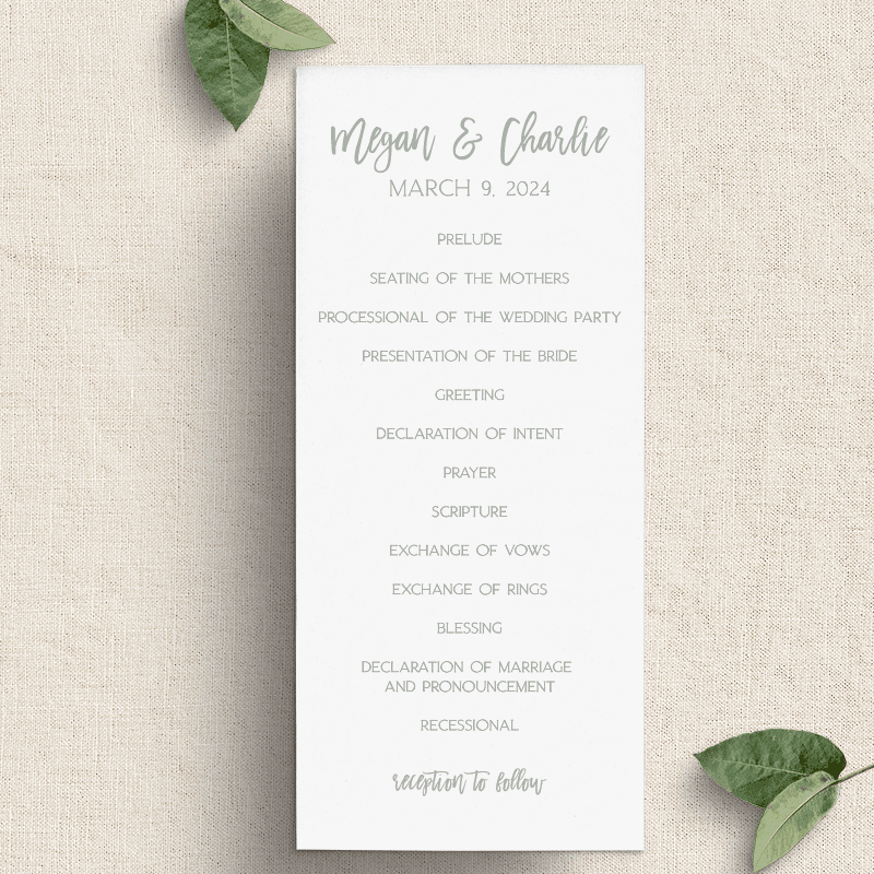 Front side has the ceremony agenda and the back includes wedding party information and a small thank you if desired.