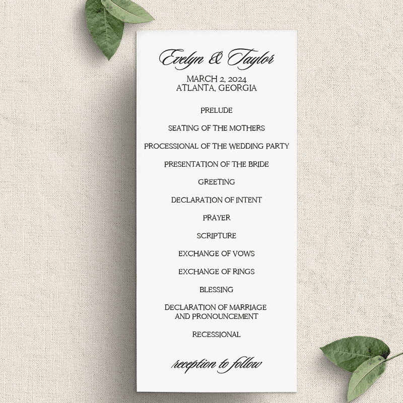 Front side has the ceremony agenda and the back includes wedding party information and a small thank you if desired.