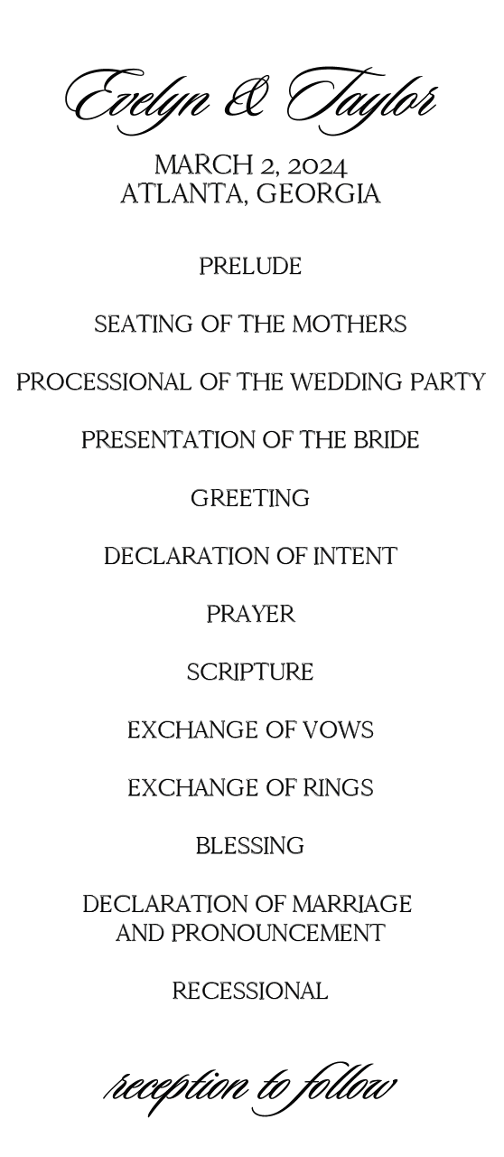 Customize for your needs, once received we will email you a form to complete for ceremony information and order along with wedding party details.